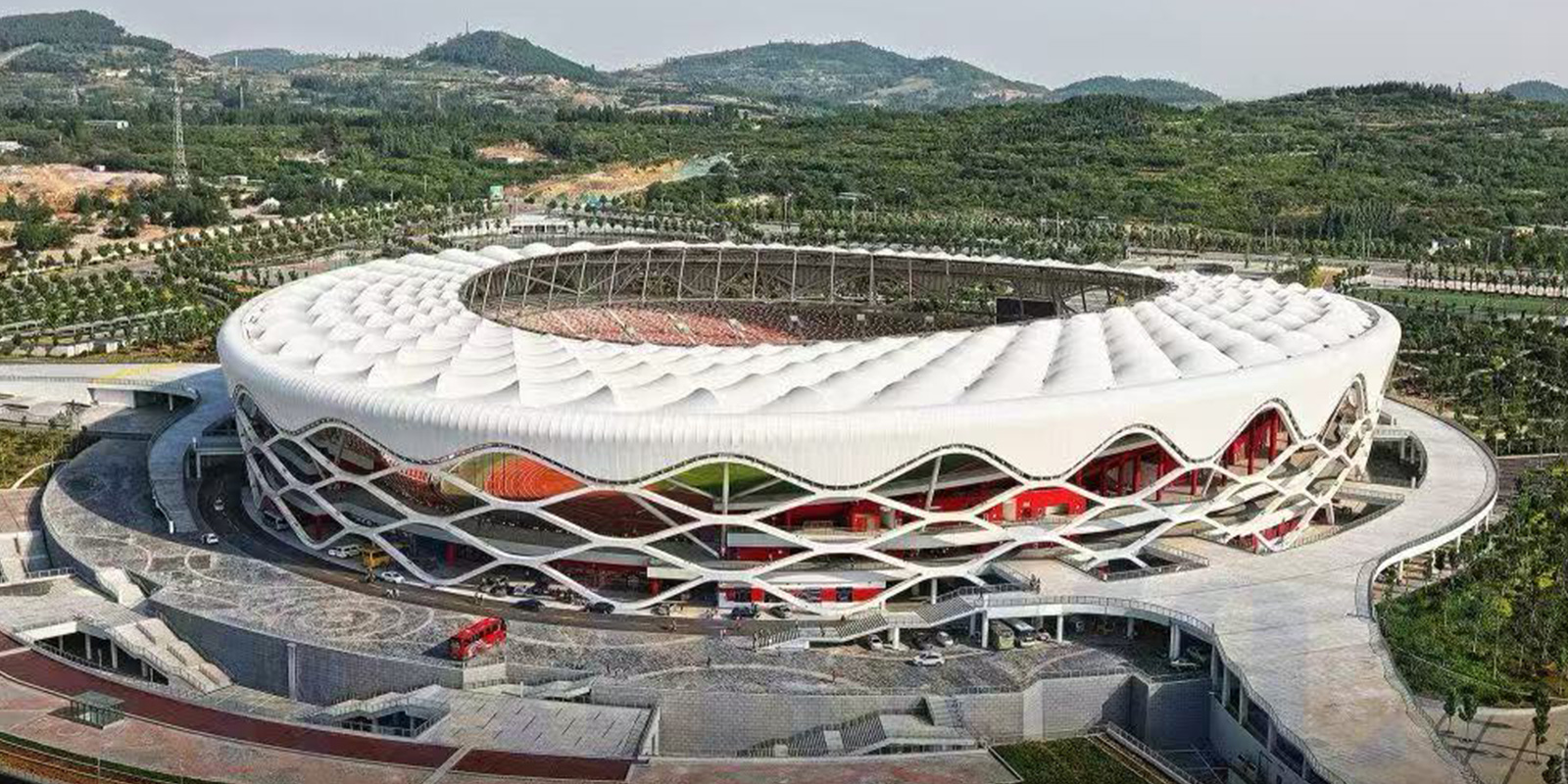 山东枣庄体育场建筑面积约54000㎡,体育场平面尺寸为260x238m,屋盖最大高度39m,高点和低点高差约4.3m,总体呈椭圆形,由看台结构、屋盖钢结构和外围拉花结构三部分组成。